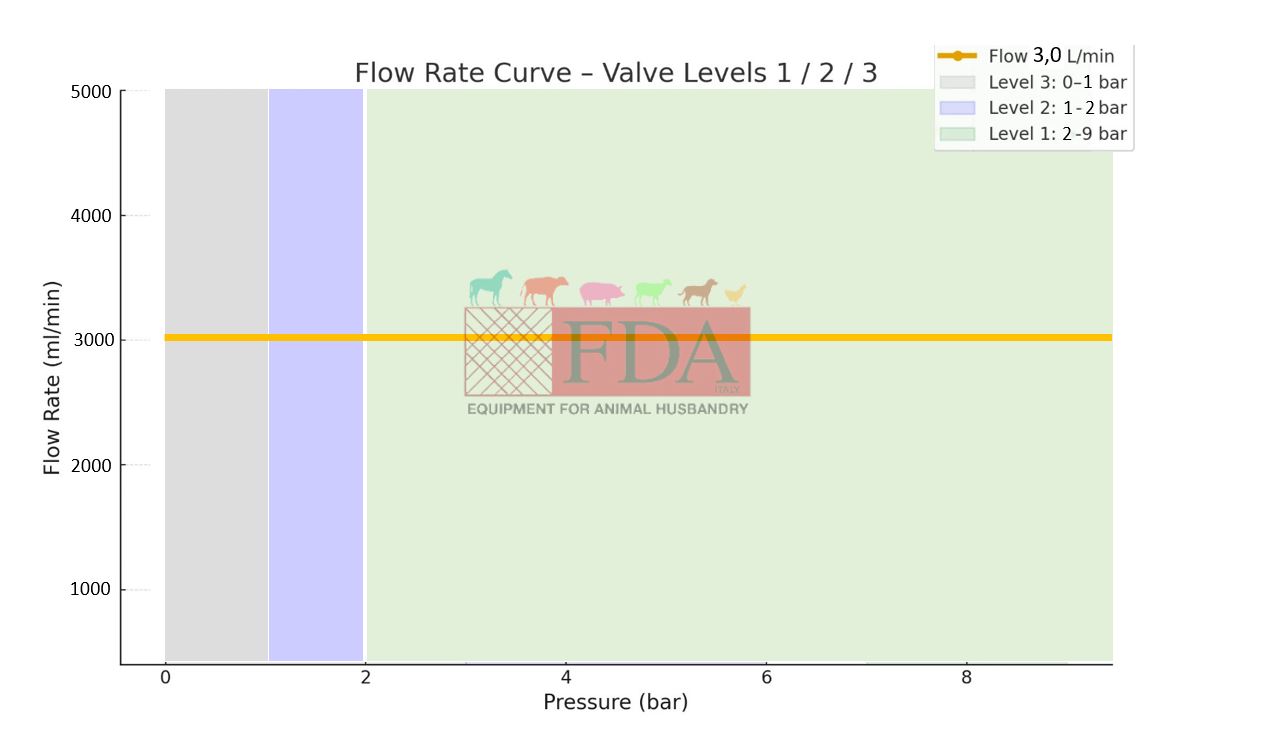Con una regolazione corretta, la portata si mantiene intorno a 1,0 L/min, garantendo un flusso costante, affidabile e adatto alle diverse condizioni di allevamento.