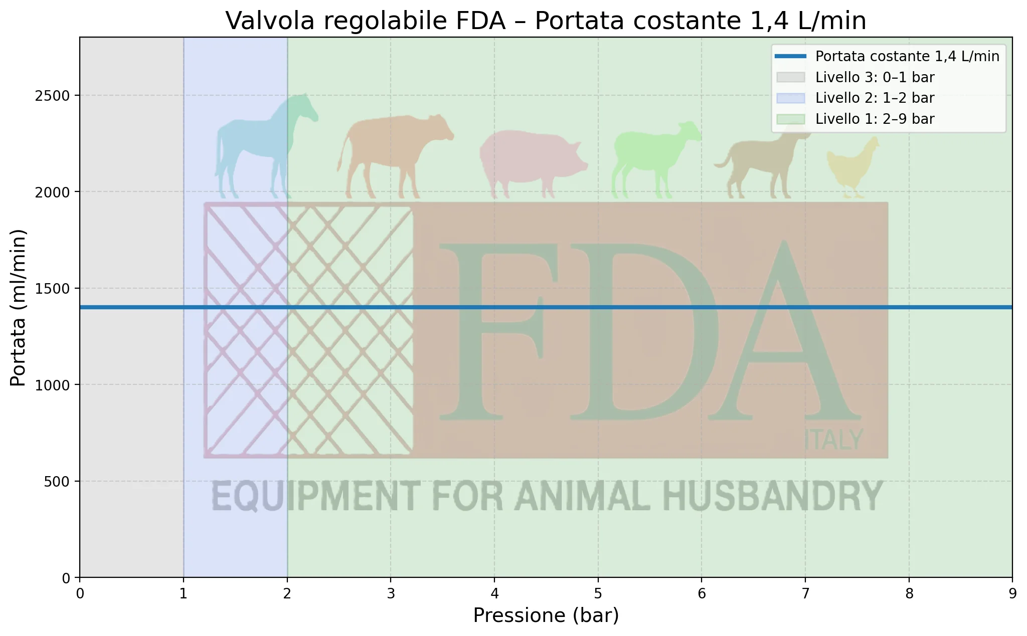 Livello 3 (0–1 bar): zona grigia, ideale per linee di abbeveraggio con bassa pressione.