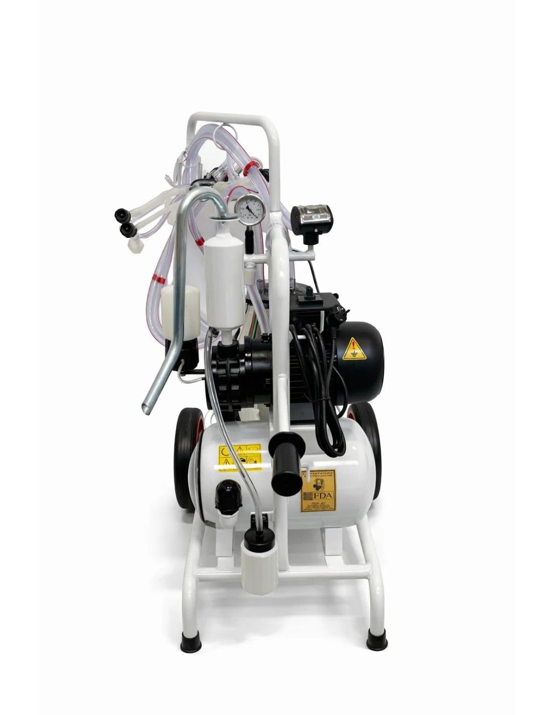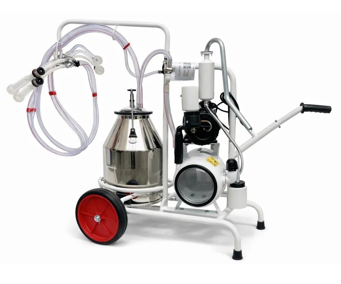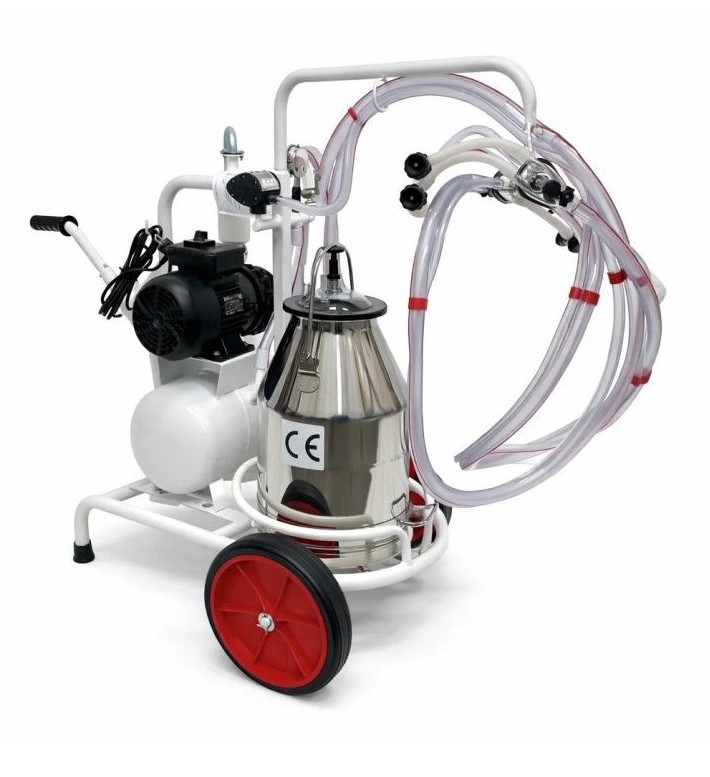 Mungitrice carrellata FA07149 per capre e pecore con 2 gruppi di mungitura e pompa del vuoto a bagno d’olio da 250 L/min. Dotata di secchio latte inox da 30 L, bossoli in policarbonato e guaine siliconiche. Sistema mobile, affidabile e certificato CE, ideale per la mungitura di due animali contemporaneamente.