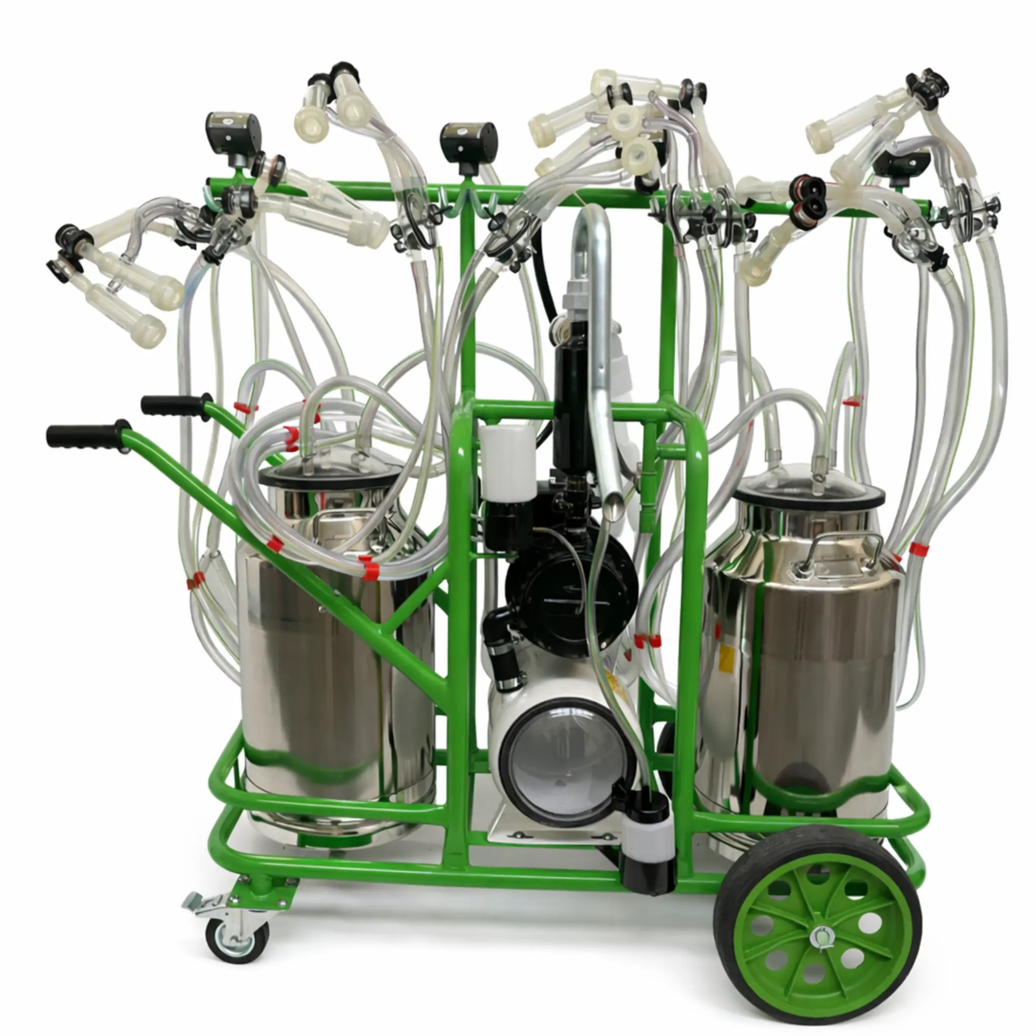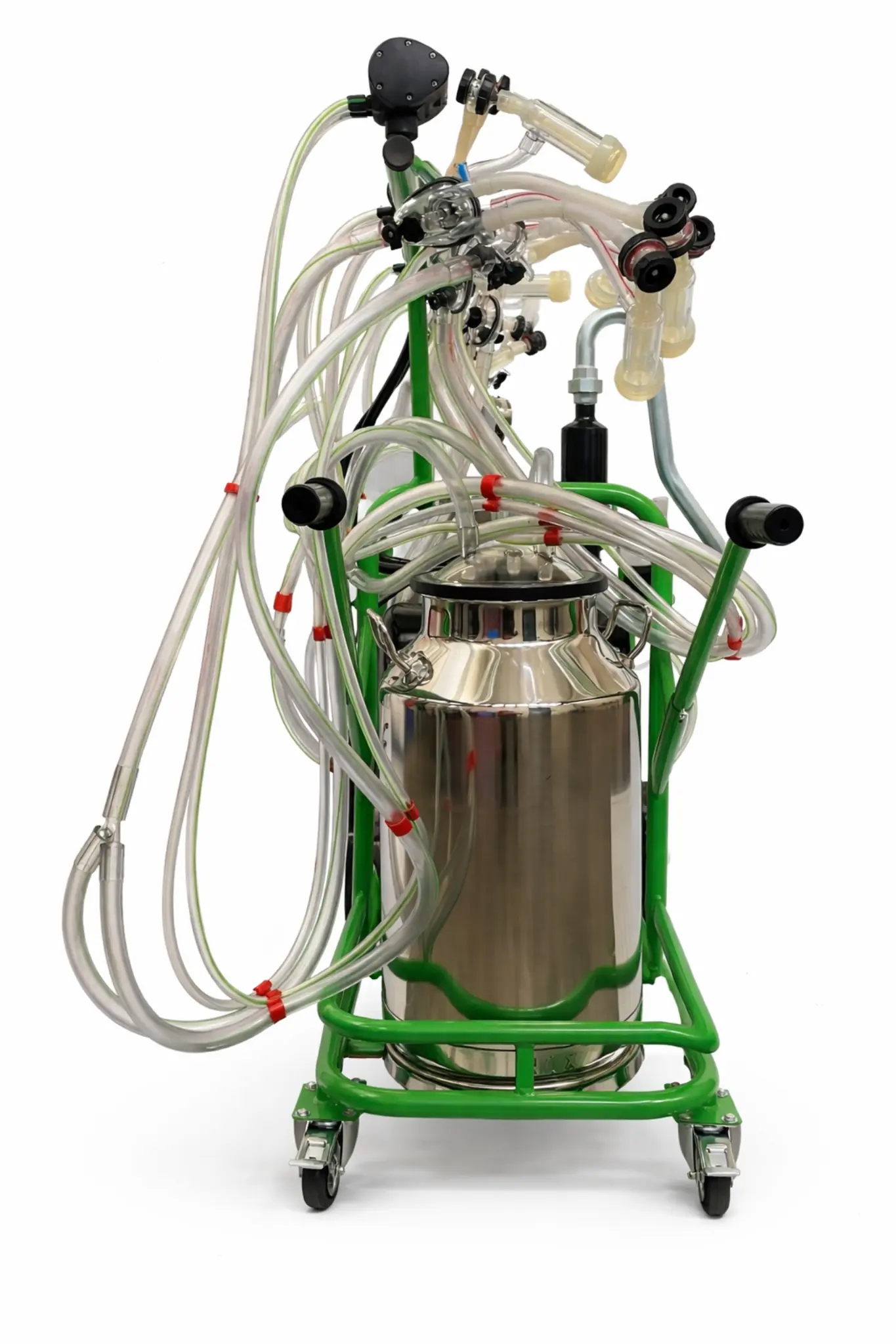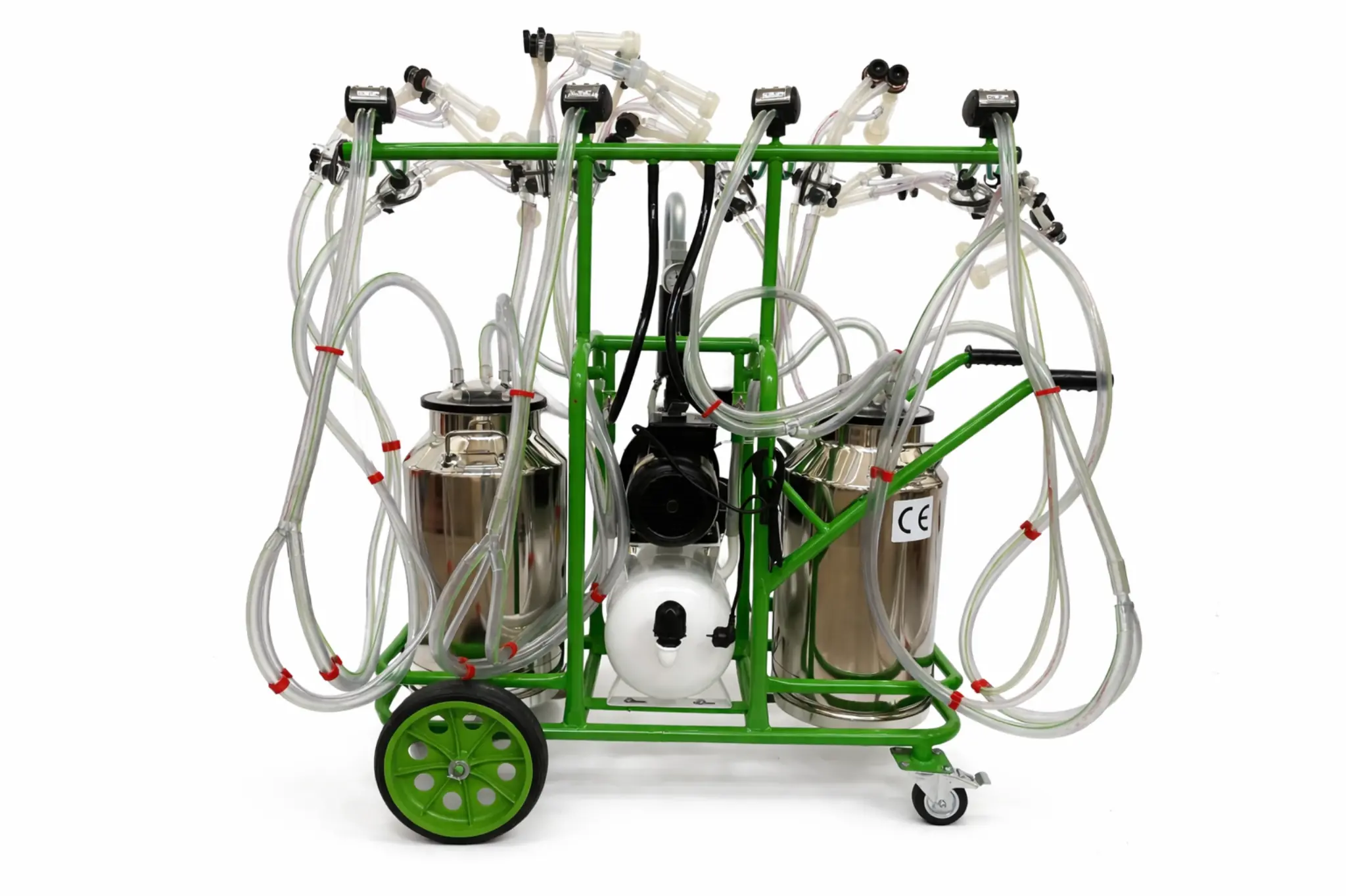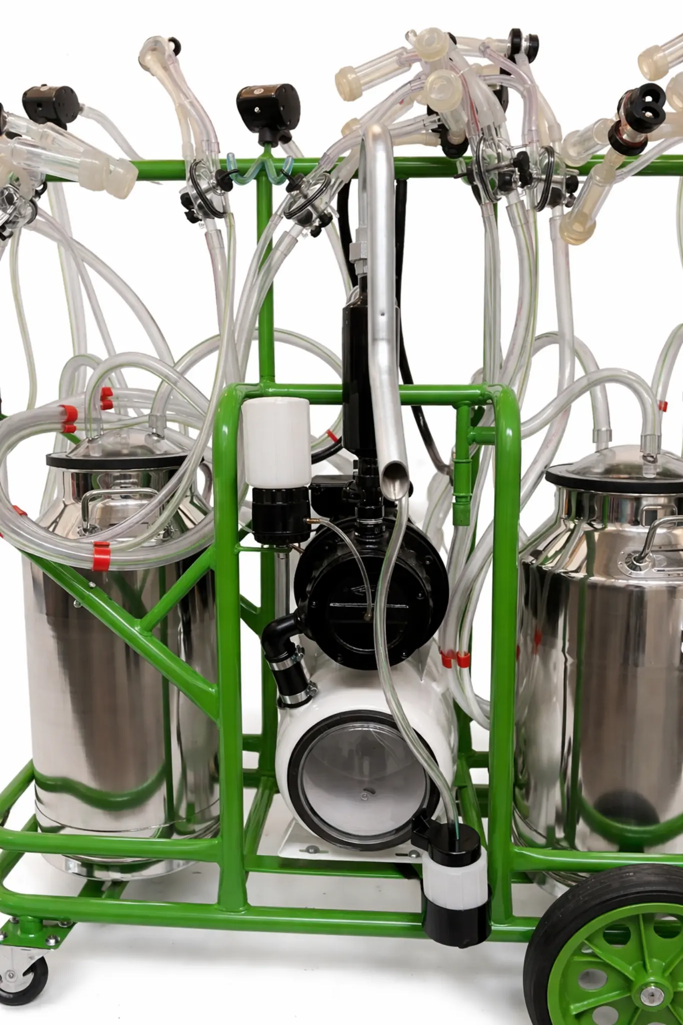 Mungitrice carrellata FA27032 per capre e pecore con 8 gruppi di mungitura e pompa del vuoto a bagno d’olio da 400 L/min. Dotata di due secchi latte inox da 40 L, bossoli in policarbonato e guaine siliconiche. Sistema mobile, affidabile e certificato CE, ideale per la mungitura simultanea di più animali.